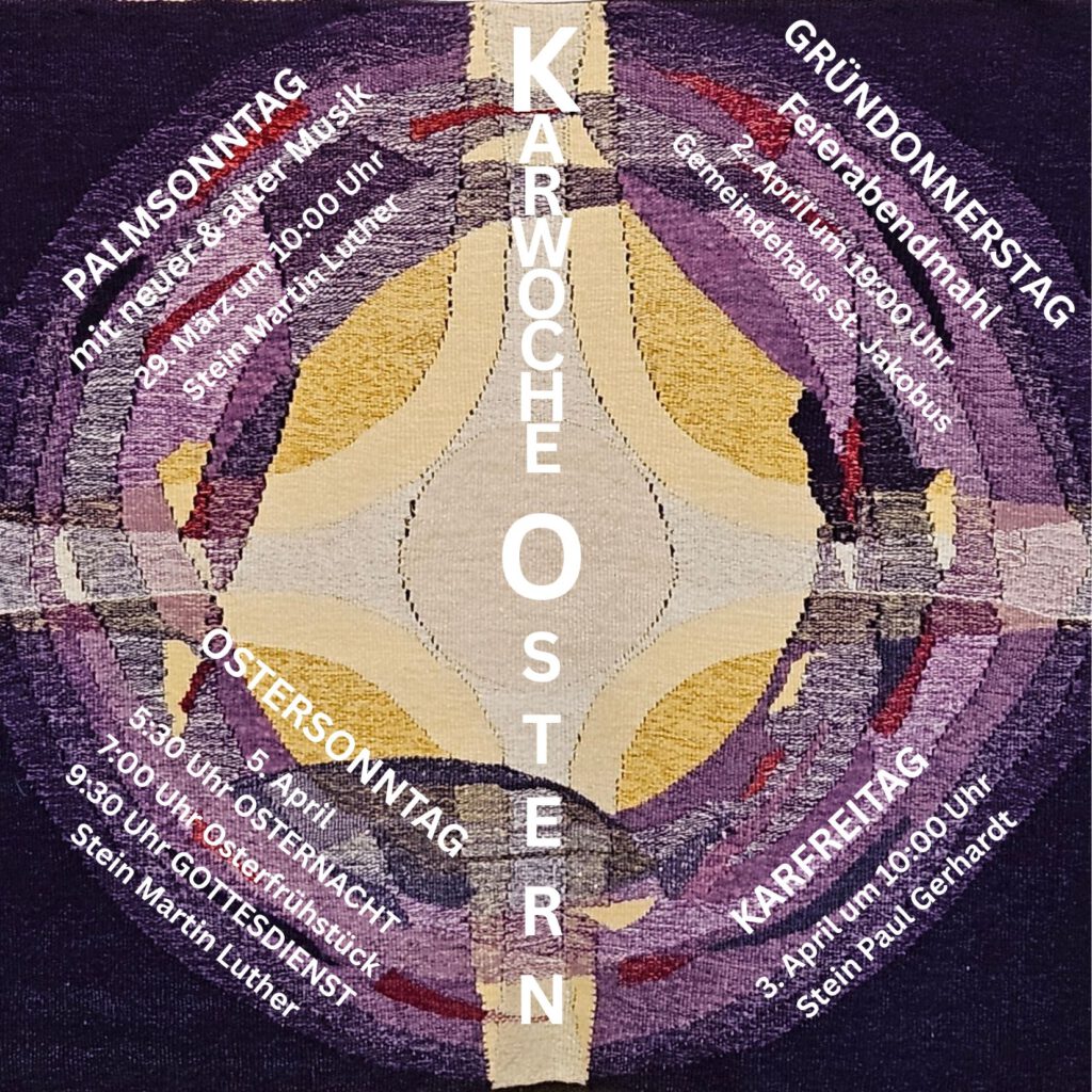 Alte und neue Musik erklingt am Palmsonntag, ein gedeckter Tisch und gute Gemeinschaft wartet am Gründonnerstag, Gebet, Gesang und Stille trösten am Karfreitag. Und dann kommt das Osterlicht: Segen, Kerzen und Licht in der Osternacht, Osterfrühstück im Gemeindehaus, Posaunenklänge und Abendmahl feiern den Ostermorgen!
